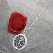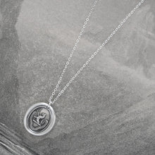 Wax seal necklace depicting a demi-rampant wolf with Latin motto "Always Hoping, Always Working". Antique wax seal charm jewelry in silver.